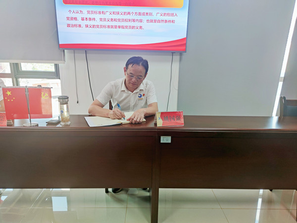 会议伊始,由邵莹莹同志带领大家学习“坚持党员标准,以实际行动争取做一名合格的党员”主题党课。从“什么是党员标准、怎么坚持党员标准、以实际行动争做合格的共产党员”三个方面进行讲解,指出学习的目的在于不断提高自己的素质,更好的指导实践、服务实践、服务社会、服务公司,从而为个人发展和公司发展能够做更多、更大的贡献。